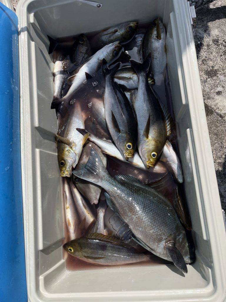 今朝はベタ凪、潮流れ無くイサキの食い渋く、13〜42 匹、外道に真鯛800g〜1kg、メジナ、ヤガラ、ウマズラハギが釣れました。