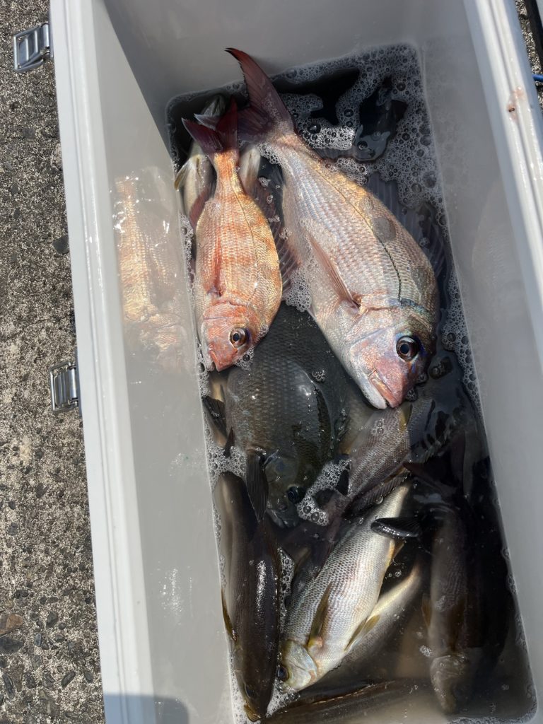 今朝は凪です。水色澄みイサキの食い渋く苦戦、5匹〜23匹、外道に真鯛、カンパチ、イシ鯛、メジナ、ウマズラハギ、