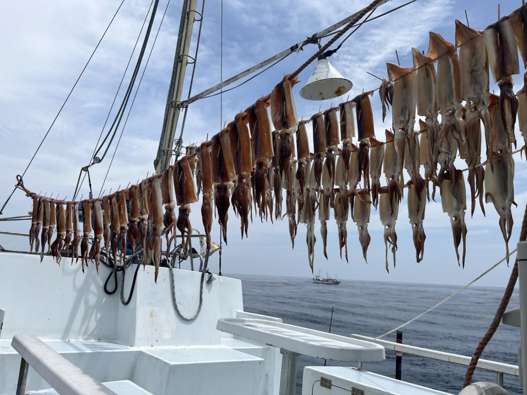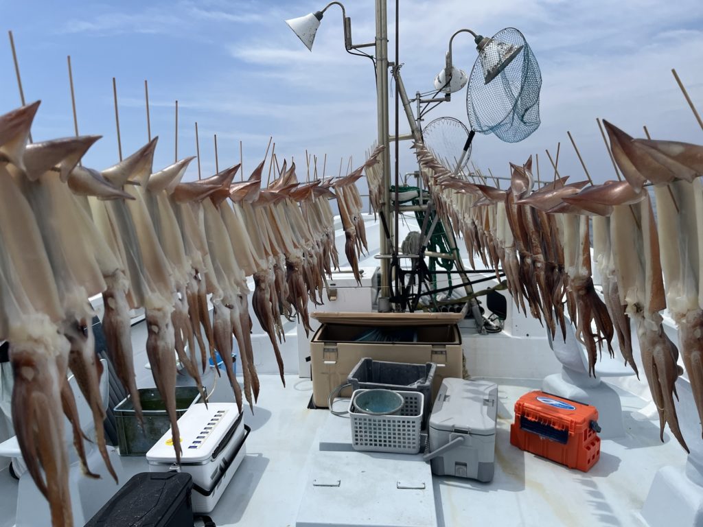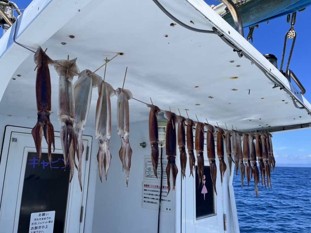 今朝はベタ凪です。朝からイカ🦑の乗り活発でした。30〜73匹でした。