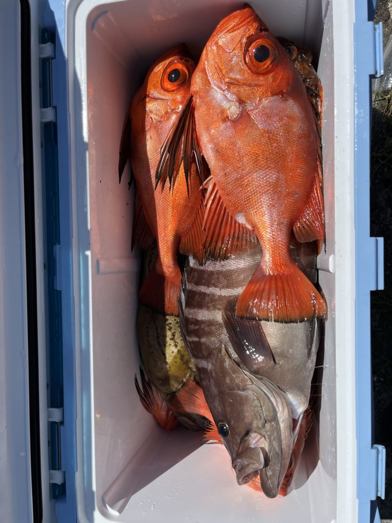 今日は五目釣り、カサゴ、キントキ、ハタ、お客さん、満足。ハタ1〜2.5kg7人で12匹キントキ、カサゴでお土産になりました。